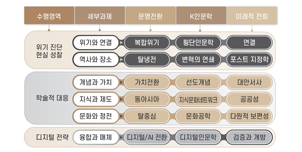 이 연구 아젠다는 '문명전환’, 'K인문학’, '미래적 전회’라는 세 키워드를 근간으로 구성된다.