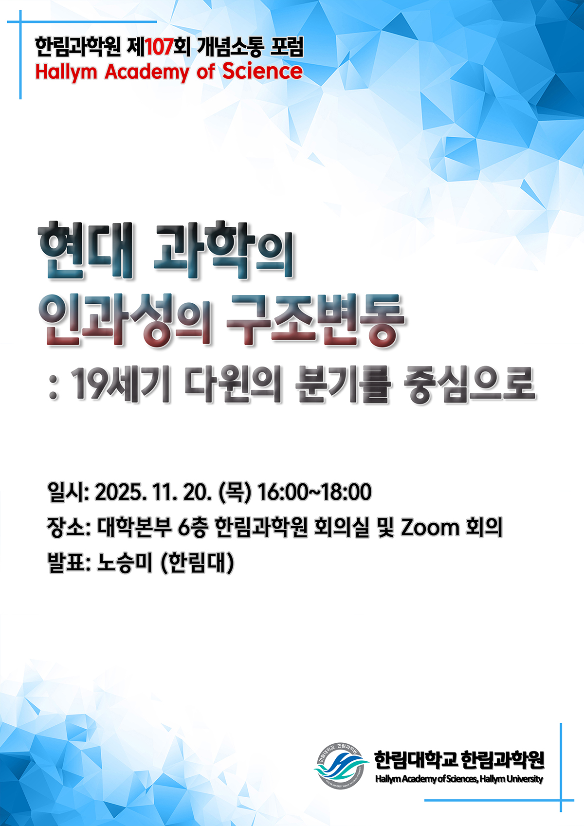 이번 포럼의 발표자는 한림과학원 노승미 선생님으로 <현대 과학의 인과성과 구조변동: 19세기 다윈의 분기를 중심으로>라는 제목으로 포럼이 진행됩니다.